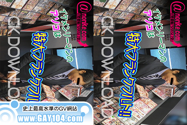それに気付いたゲイ店員が、棚の隙間からチ〇コにタッチすると、突然のことに驚き逃げるイケメンリーマン。